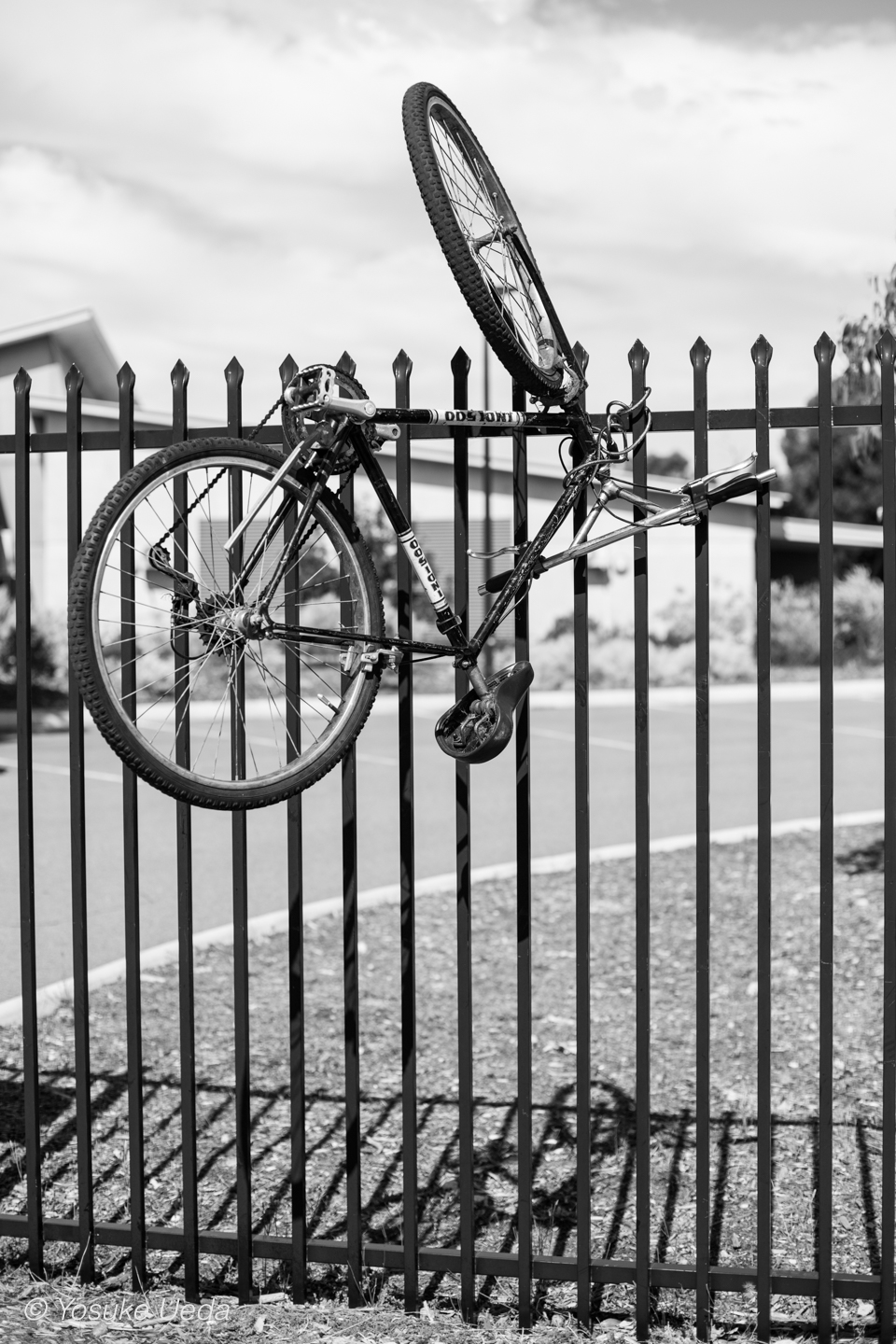 先週見かけたショボイ黒い自転車。学校の駐車場のフェンスに逆さまにぶら下がっていた。吊るされている自転車を見て、ふとあのかっこいい赤い自転車を思い出した。