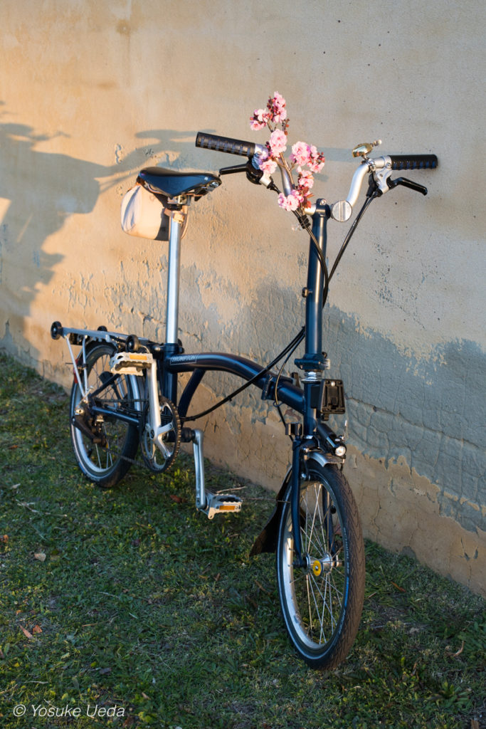 庭師のおじさんが切ってくれた小枝をブロンプトンのハンドルバーに飾った。
